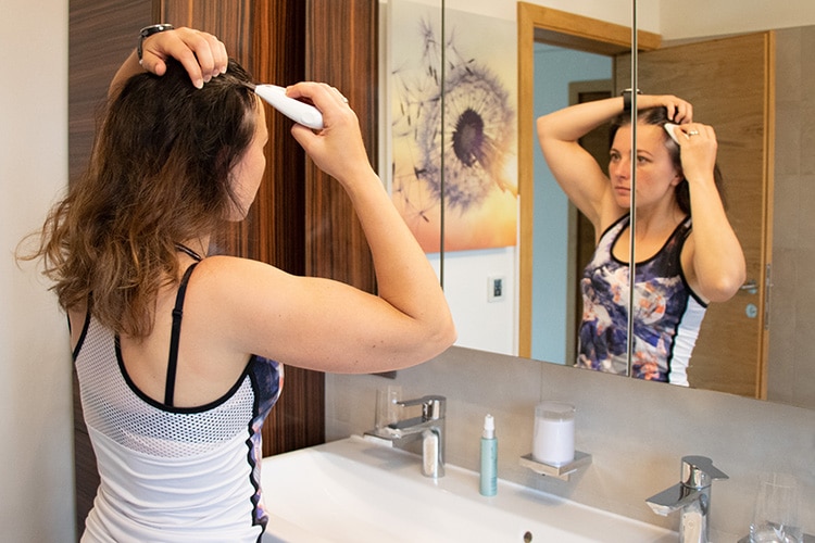 Trockene, juckende Kopfhaut? Mit dem Galvanic Spa können Sie nicht nur Ihre Kopfhaut beruhigen, sondern auch das Haarwachstum fördern. Mittels Kopfhautaufsatz und dem Intensive Scalp & Hair Serum wird die Kopfhaut behandelt. Die Haare sollten dazu feucht sein, damit der galvanische Strom gut fließen kann. Das Haar-Serum wird direkt auf den Haarwurzeln aufgesprüht. Am besten teilst du dazu das Haar mittel Scheitel auf und sprühst so dicht wie möglich an die Haarwurzeln. Massiere das Serum zuerst mit den Fingerspitzen ein und kämme mit dem Galvanic vom vorderen Haaransatz bis nach hinten. Diese Behandlung sollte ebenfalls 2-mal täglich durchgeführt werden, um langfristig einen dichteren Haarwuchs zu erhalten.