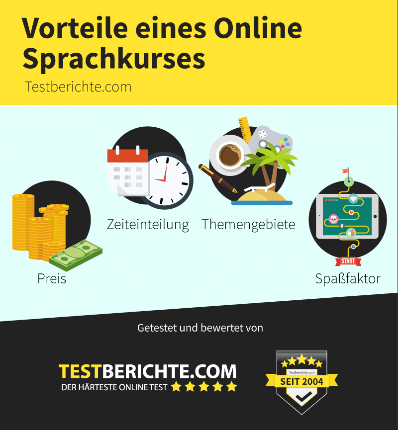 Wenn Ihre gewählte Fremdsprache eine Auswahl an Anbietern erlaubt, legen Sie sich nicht voreilig fest. Nutzen Sie erst die Probezeit aus und sehen Sie sich die kostenlosen Übungen in Ruhe an. Vergleichen Sie die Angebote und Preise der Online Sprachkurse. Unsere Testberichte helfen Ihnen dabei, den perfekt für Sie zugeschnittenen Anbieter zu finden!